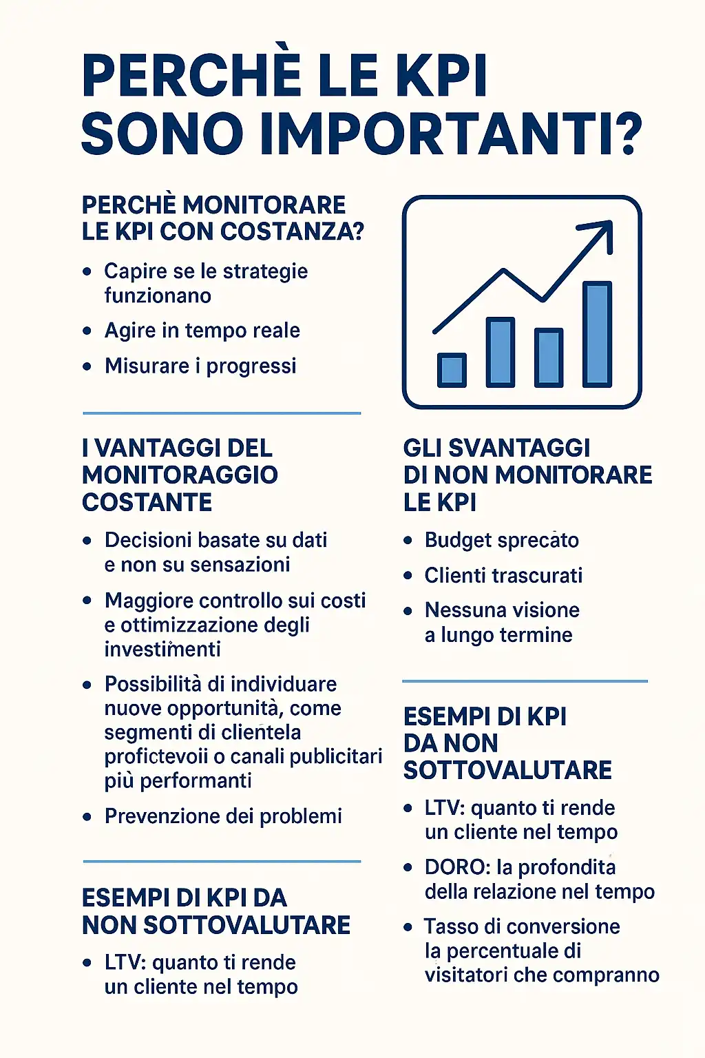 - Budget sprecato: senza KPI rischi di buttare soldi in campagne pubblicitarie inefficaci.